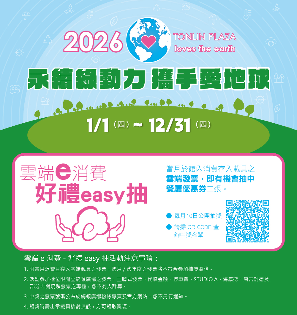 2026 年 2 月至 2027 年 1 月每月 10 日將會從上個月消費雲端發票中抽出中獎發票號碼及載具號碼公佈於官網,請中獎人自行兌獎並依指定日期完成領獎,未於領獎截止日期領取獎品者,或有資格不符者,視同放棄並取消中獎資格。主辦單位保留獎品之權利,且無需通知或公佈。
